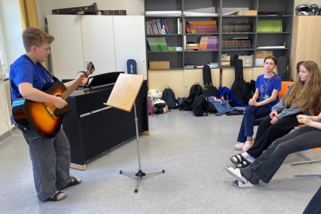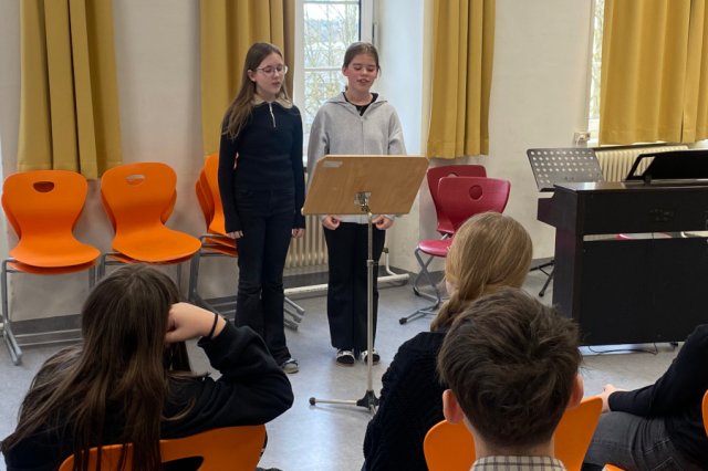 Auch musikalisch wurde viel geboten: Mehrere Schülerinnen trauten sich, alleine oder zu zweit vor der Klasse zu singen. Auch hier war Abwechslung geboten: Ein Musicalsong, eine Popballade und ein Rocksong zeigten, wie unterschiedlich die musikalischen Vorlieben der einzelnen Personen sind. Besonders überraschend war die spontane Gründung eines neuen Duos mit Ukulele und Querflöte.